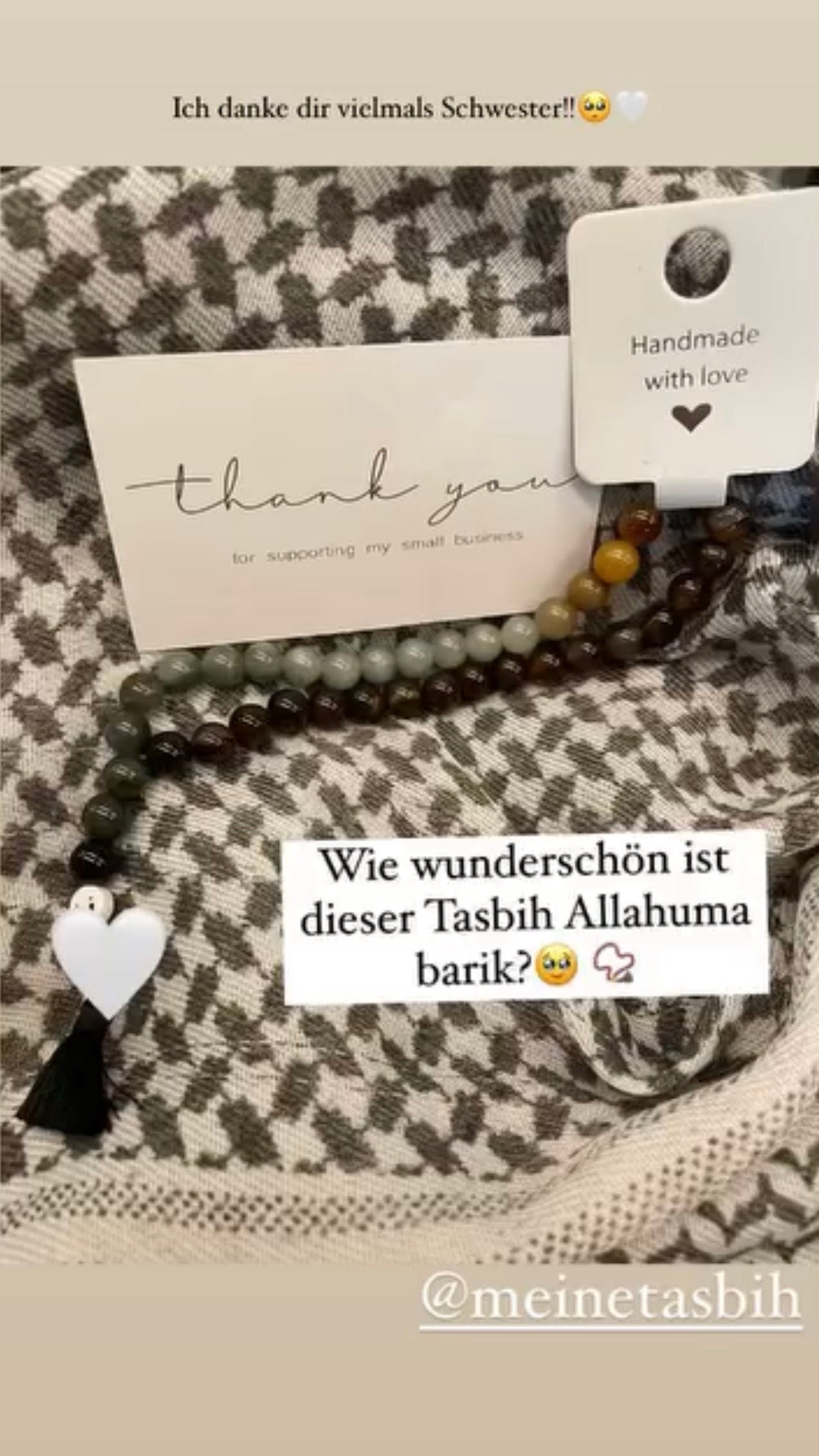 „Ich habe die Tasbih erhalten. Ich danke dir sehr!! Sie sind einfach wunderschön. Sie waren schon auf den Bildern wunderschön doch in echt nochmals ein anderes Level🩷🩷 Deine Arbeit ist wirklich toll und sehr schön🩷 Danke viel viel mals! Mein Mann und ich waren voller Freude🩷“ - @luana.kx