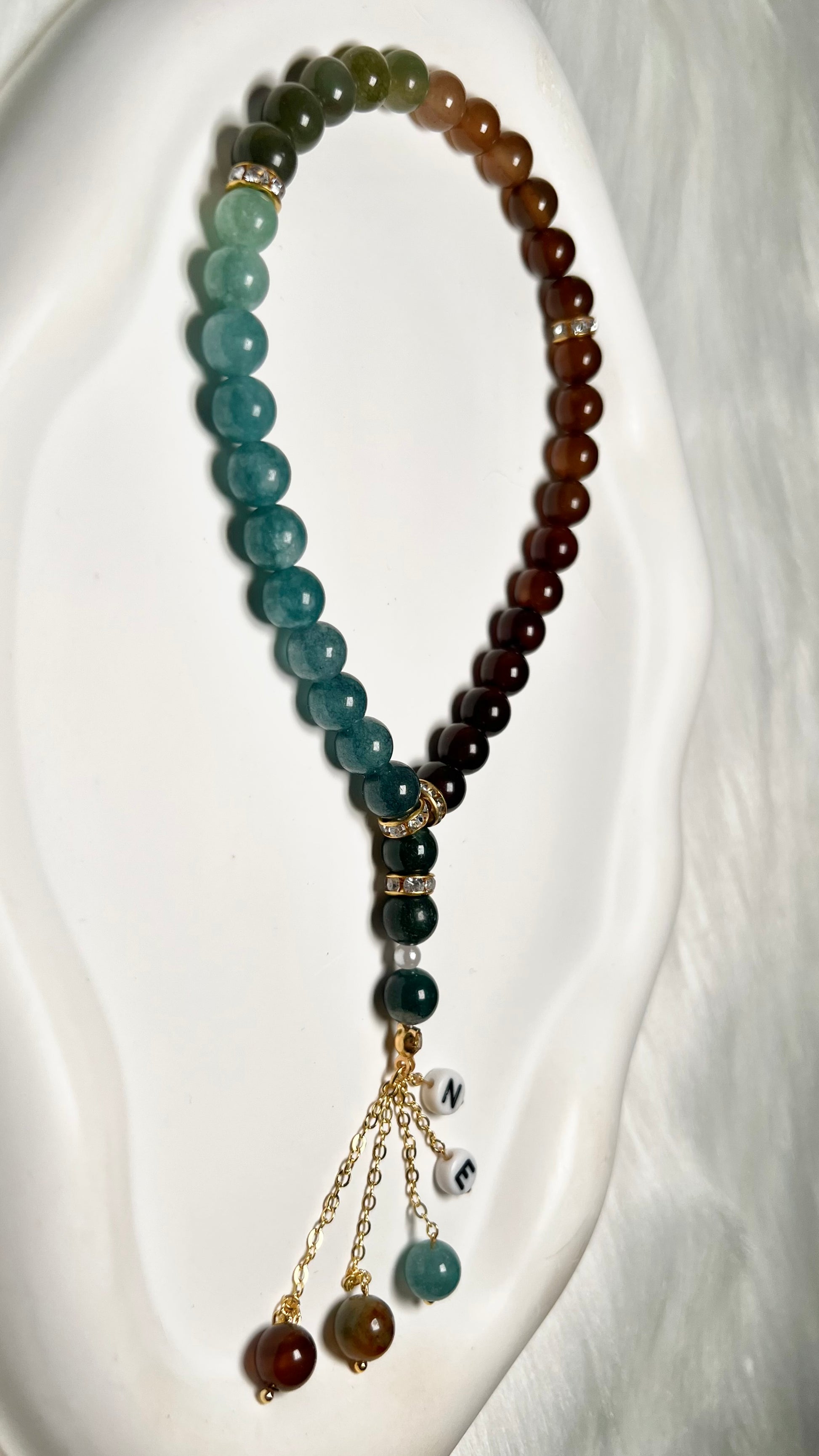 Drei Augenfarben verbunden in einer unserer handgefertigten, personalisierbaren Gebetsketten.
