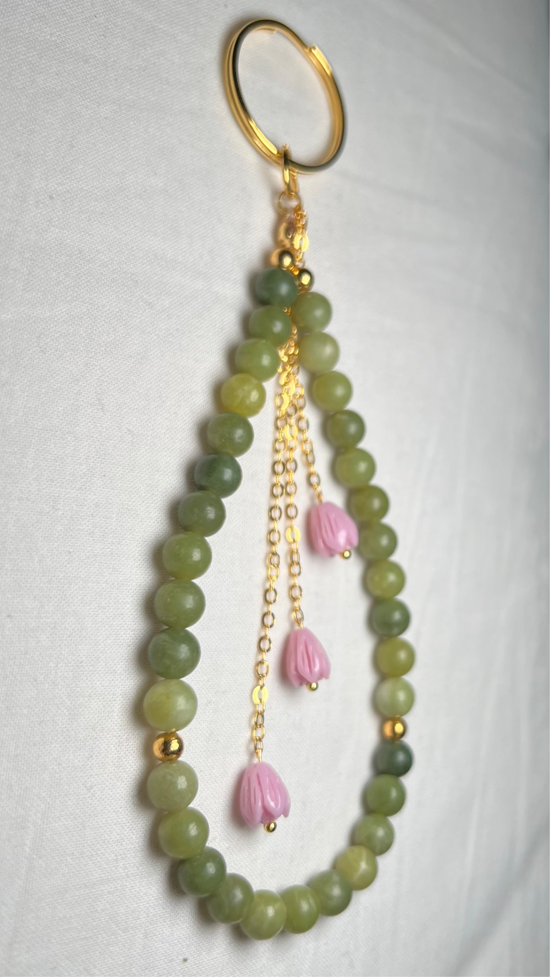 Ein Gebetsketten-Schlüsselanhänger gestaltet im Tulpenstil - Die Gebetsperlen (33 Stück) in sanften Grüntönen liegen angenehm in der Hand und ermöglichen ein fließendes, konzentriertes Zählen.