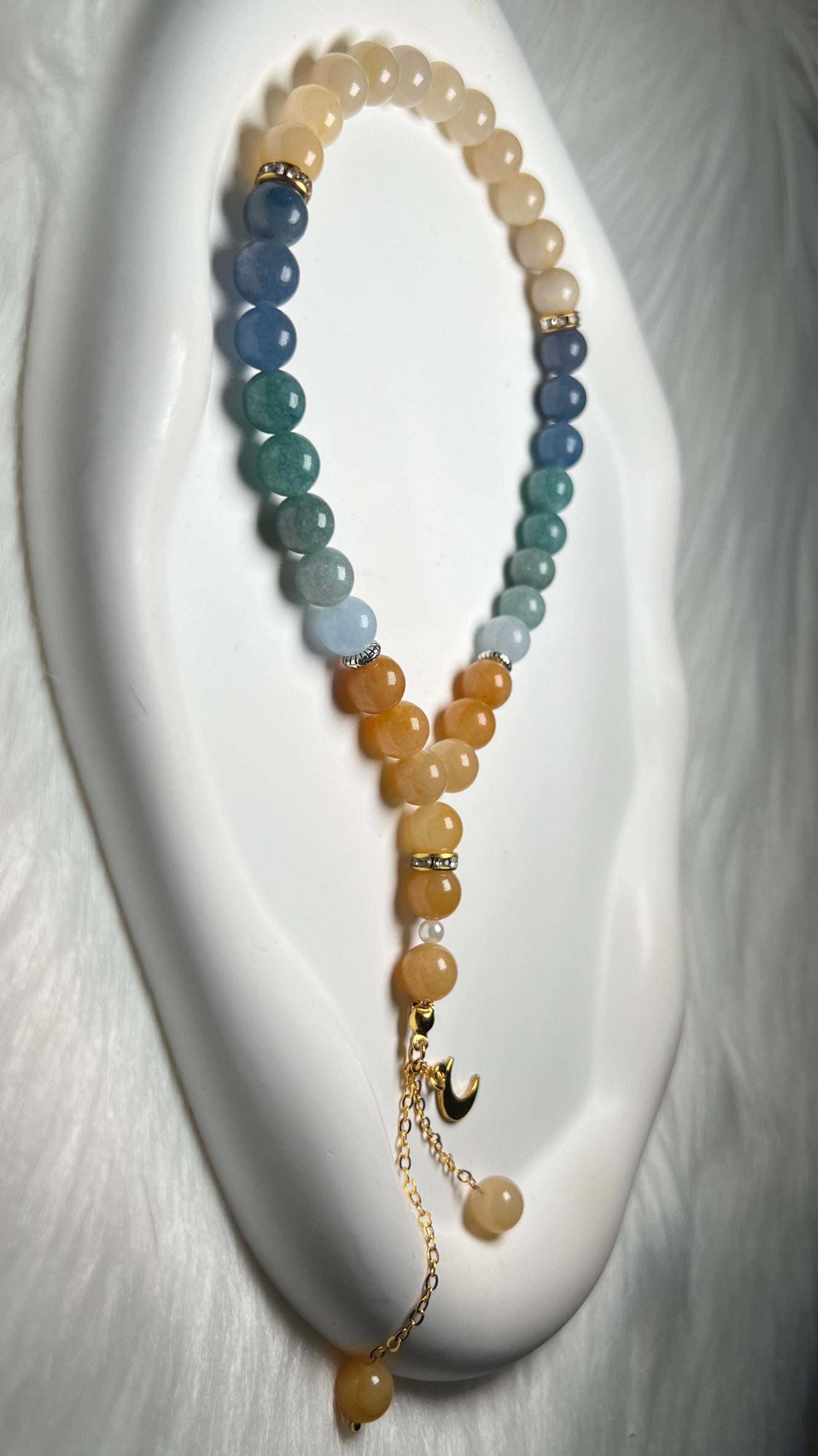 Die Perlen dieser Gebetskette spiegeln die charakteristischen Farben der Al-Aqsa Moschee in Palästina wider - die warmen Goldtöne der Kuppel, die tiefen Blau- und Türkistöne der Wände und die Erdtöne der Umgebung.