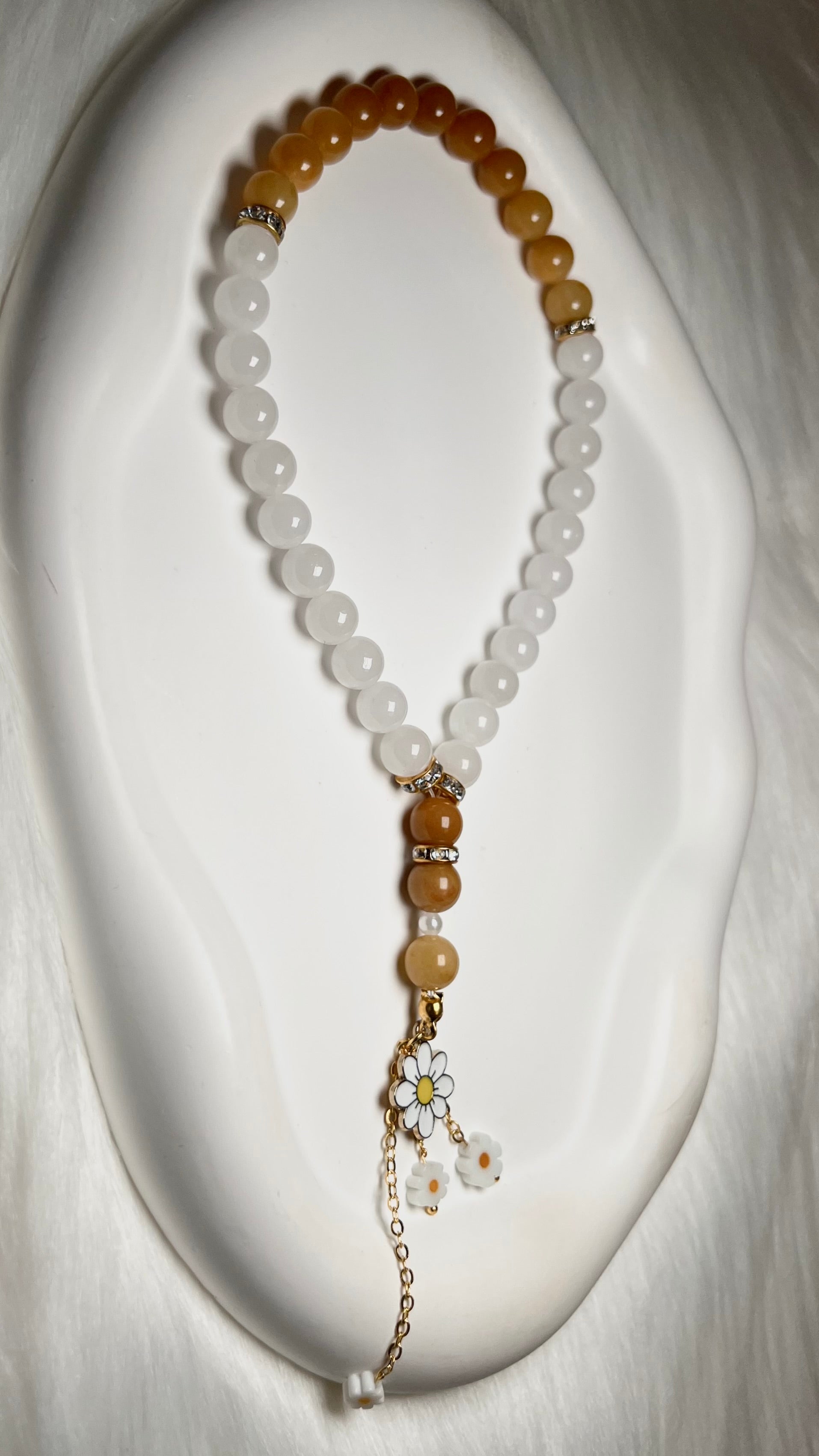 Eine Gebetskette gestaltet im Gänseblümchenstil - Die Gebetsperlen in warmen Gelbtönen liegen angenehm in der Hand und ermöglichen ein fließendes, konzentriertes Zählen.