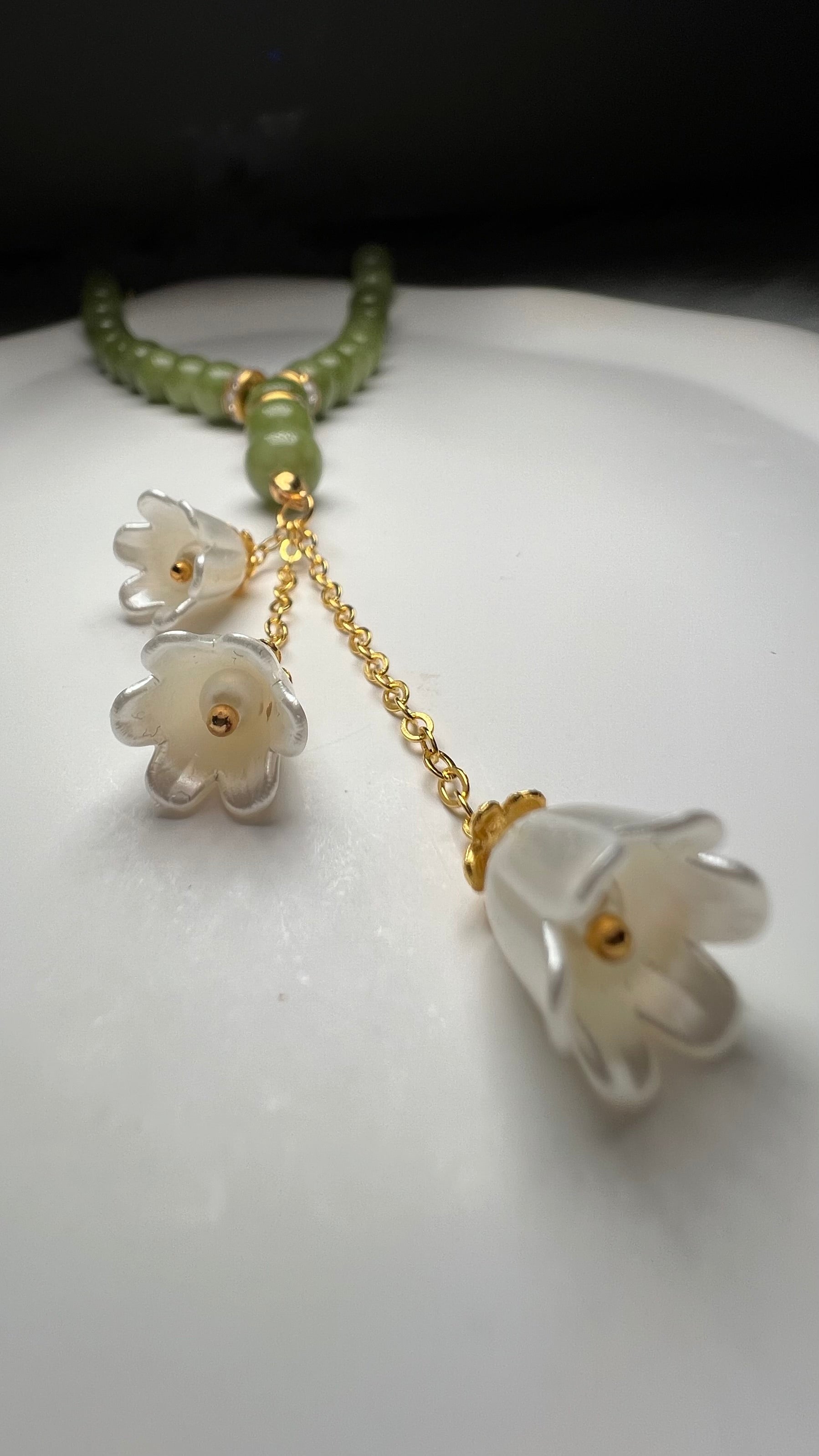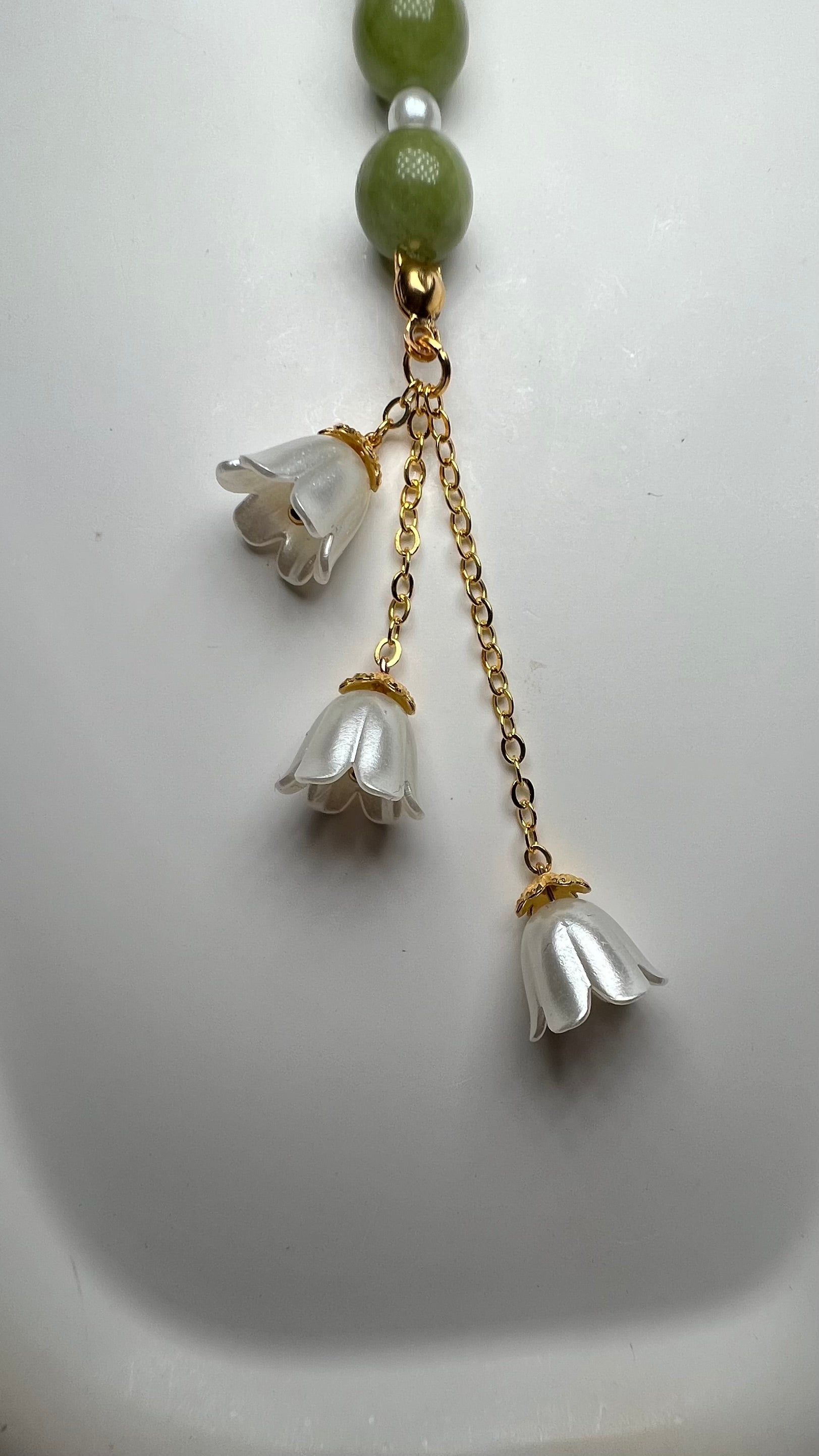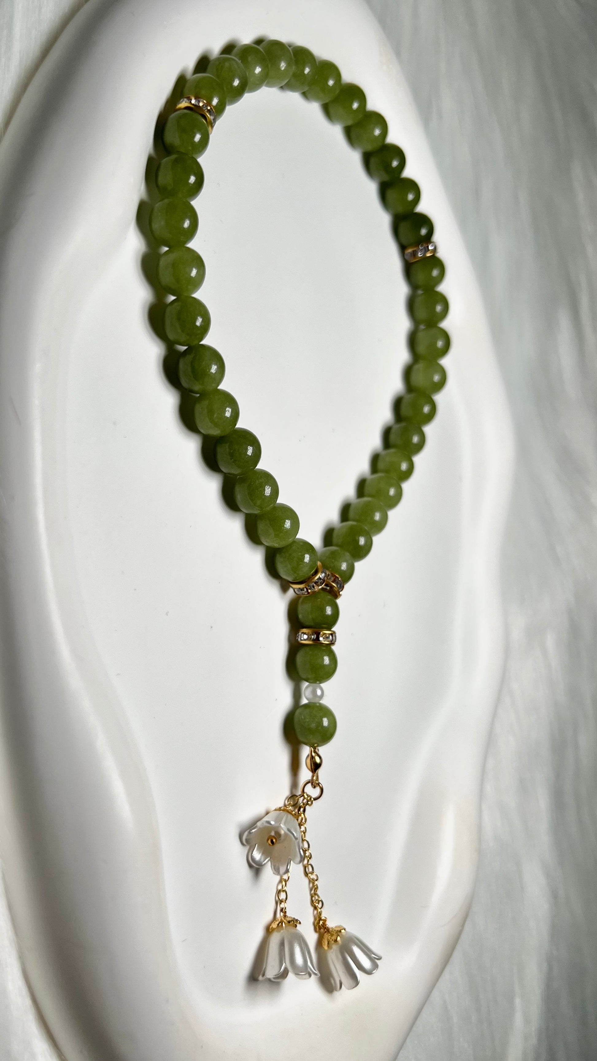 Eine Gebetskette gestaltet im Maiglöckchen Stil - Die Gebetsperlen in sanften Grüntönen liegen angenehm in der Hand und ermöglichen ein fließendes, konzentriertes Zählen.