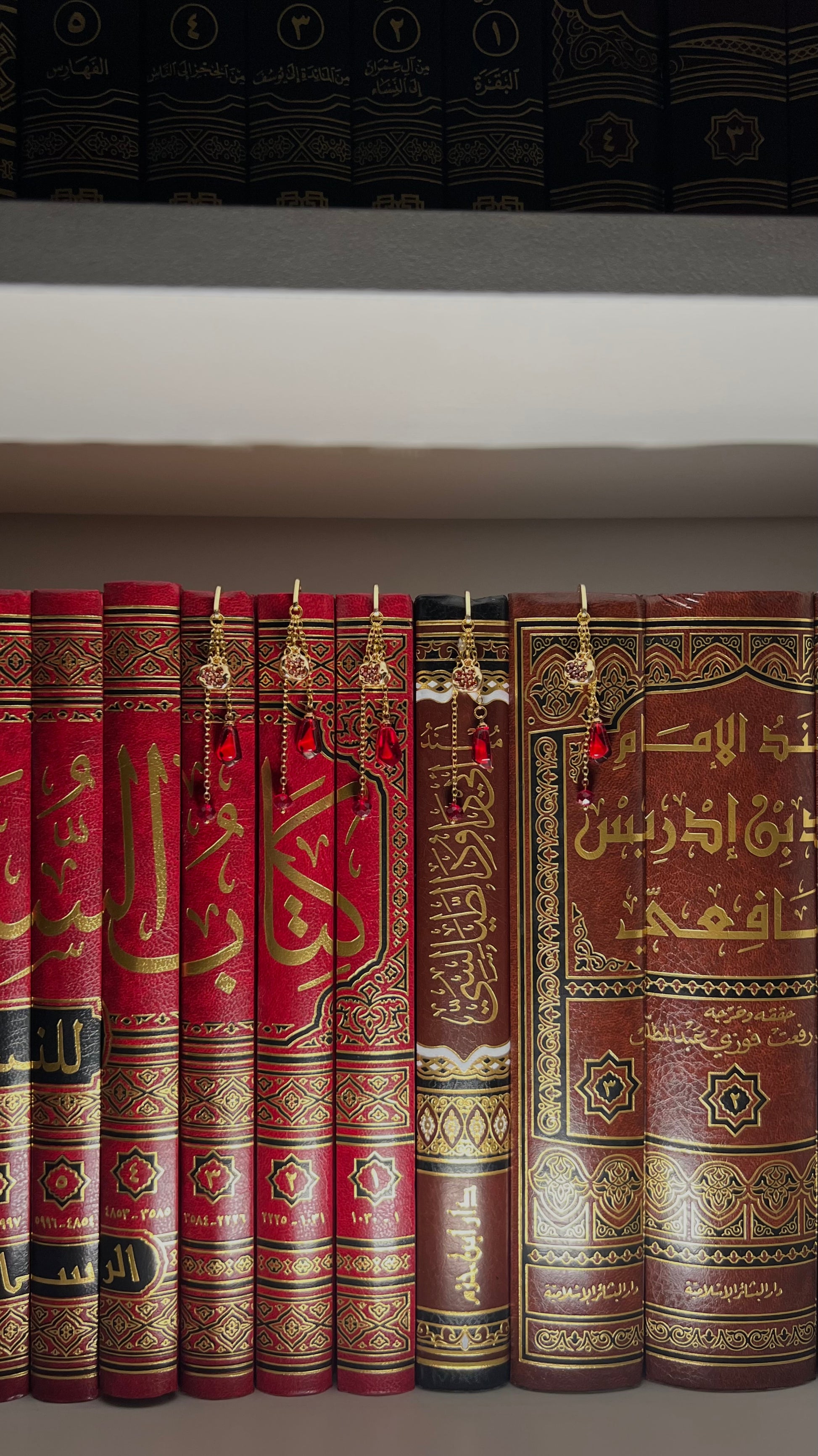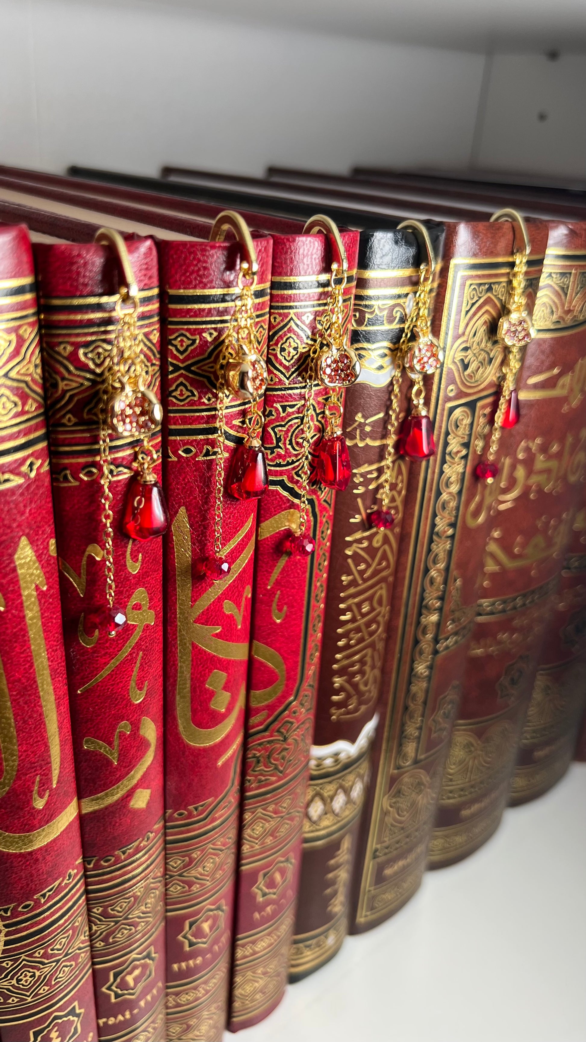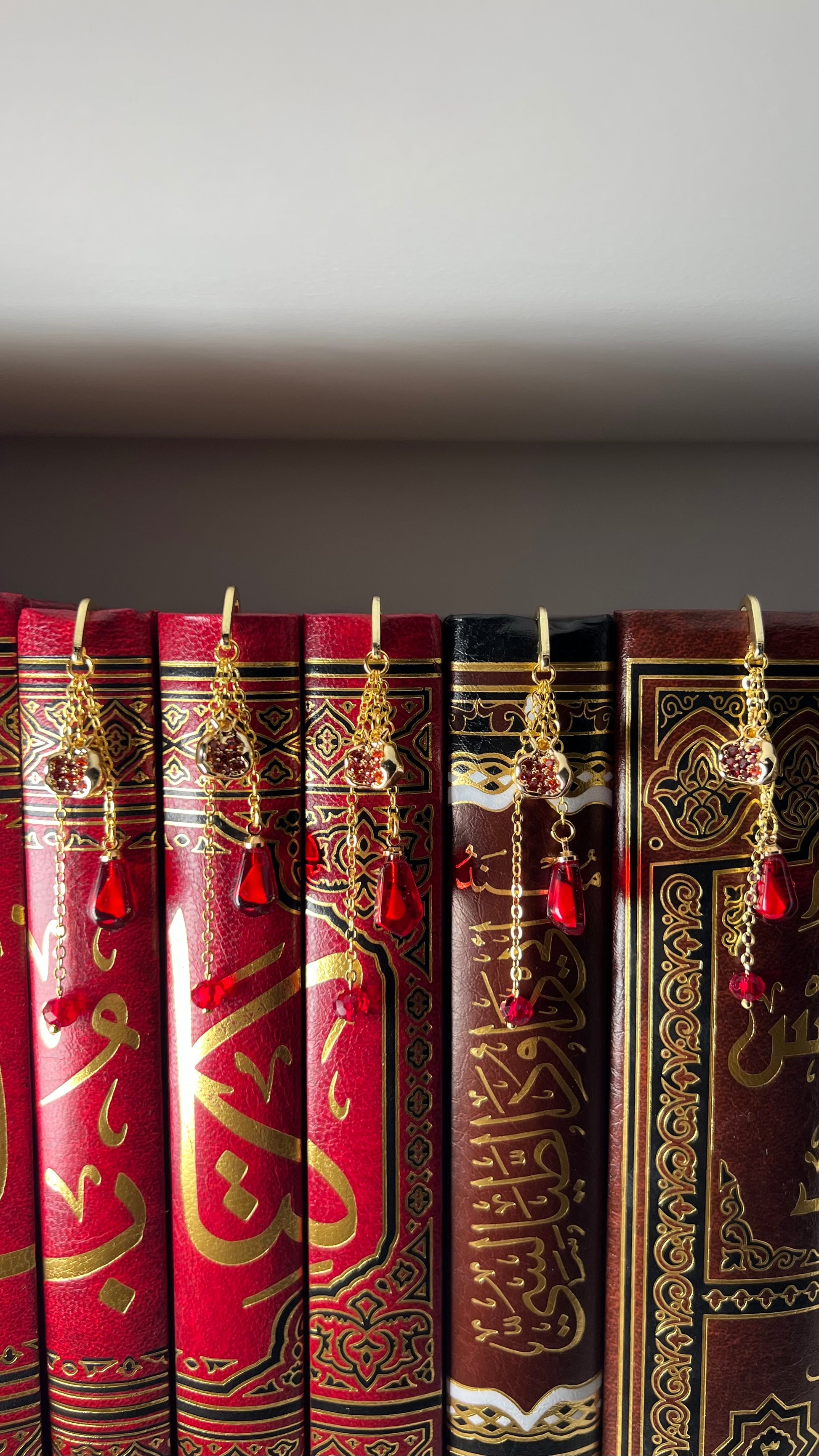 Von dem einzigartigen Lesezeichen „Nar“ hängen ein goldener Granatapfelanhänger und Granatapfelkern.