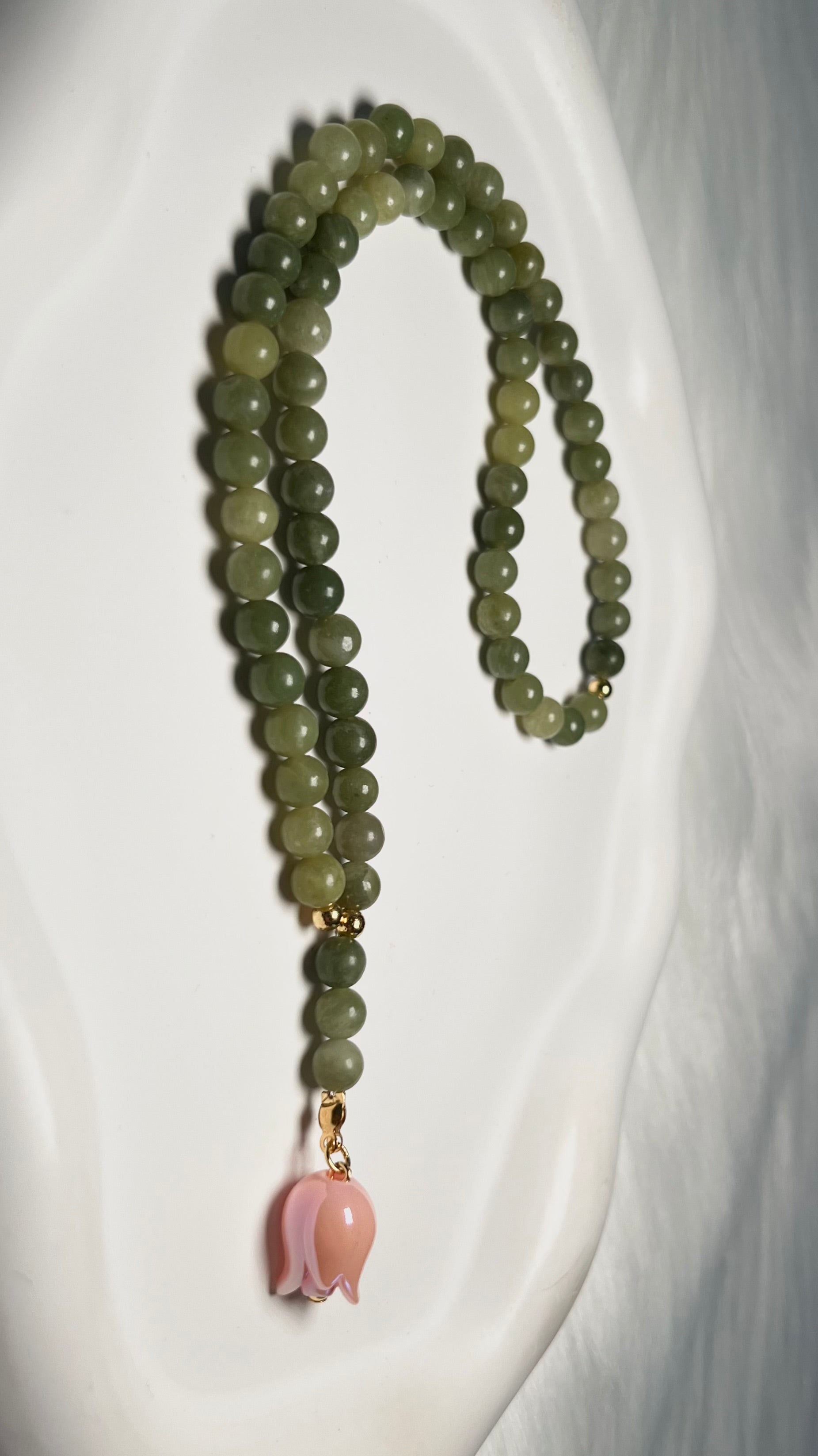Eine Gebetskette gestaltet im Tulpenstil - Die Gebetsperlen in sanften Grüntönen liegen angenehm in der Hand und ermöglichen ein fließendes, konzentriertes Zählen.