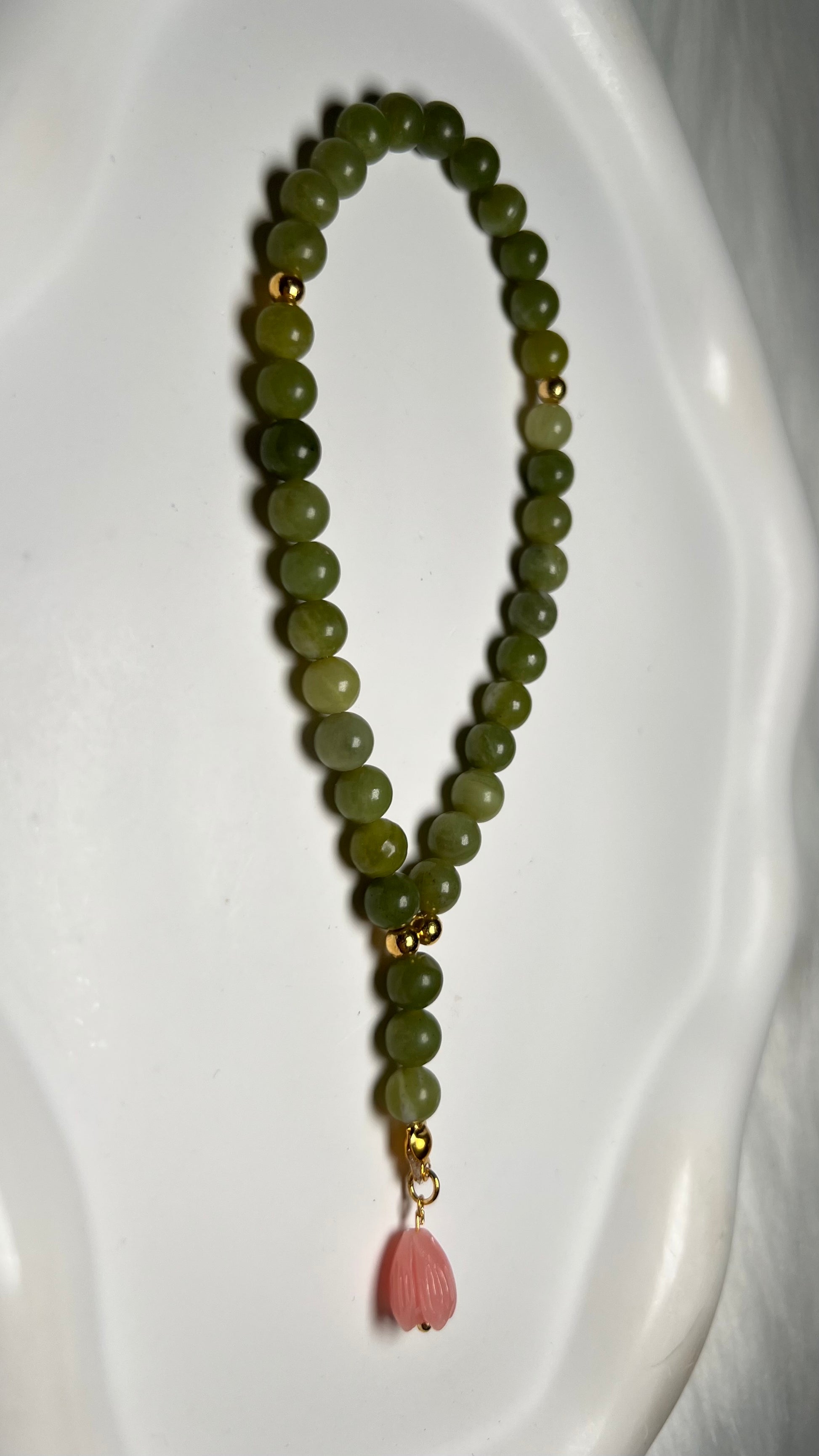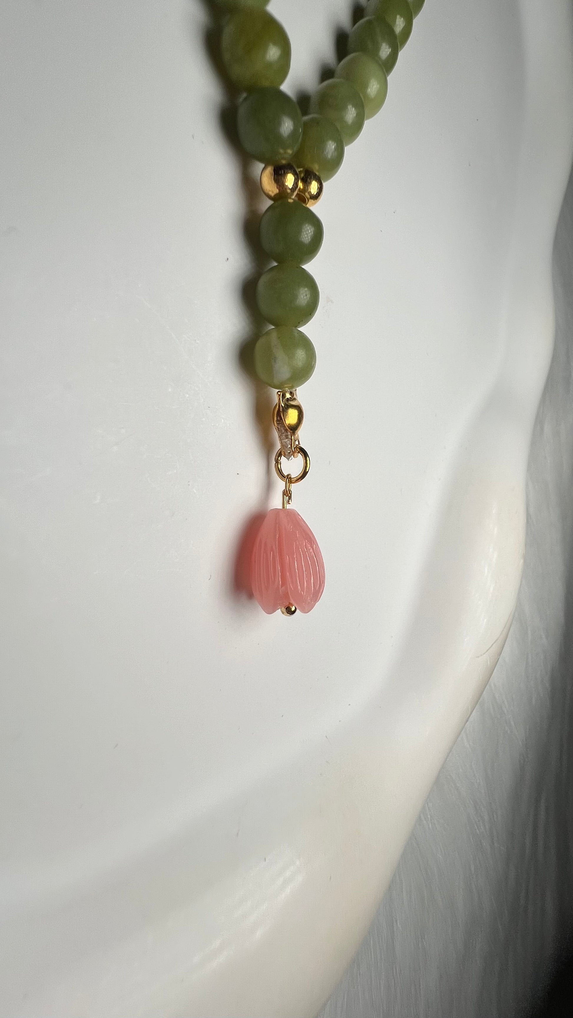 Eine Gebetskette gestaltet im Tulpenstil - Die Gebetsperlen in sanften Grüntönen liegen angenehm in der Hand und ermöglichen ein fließendes, konzentriertes Zählen.